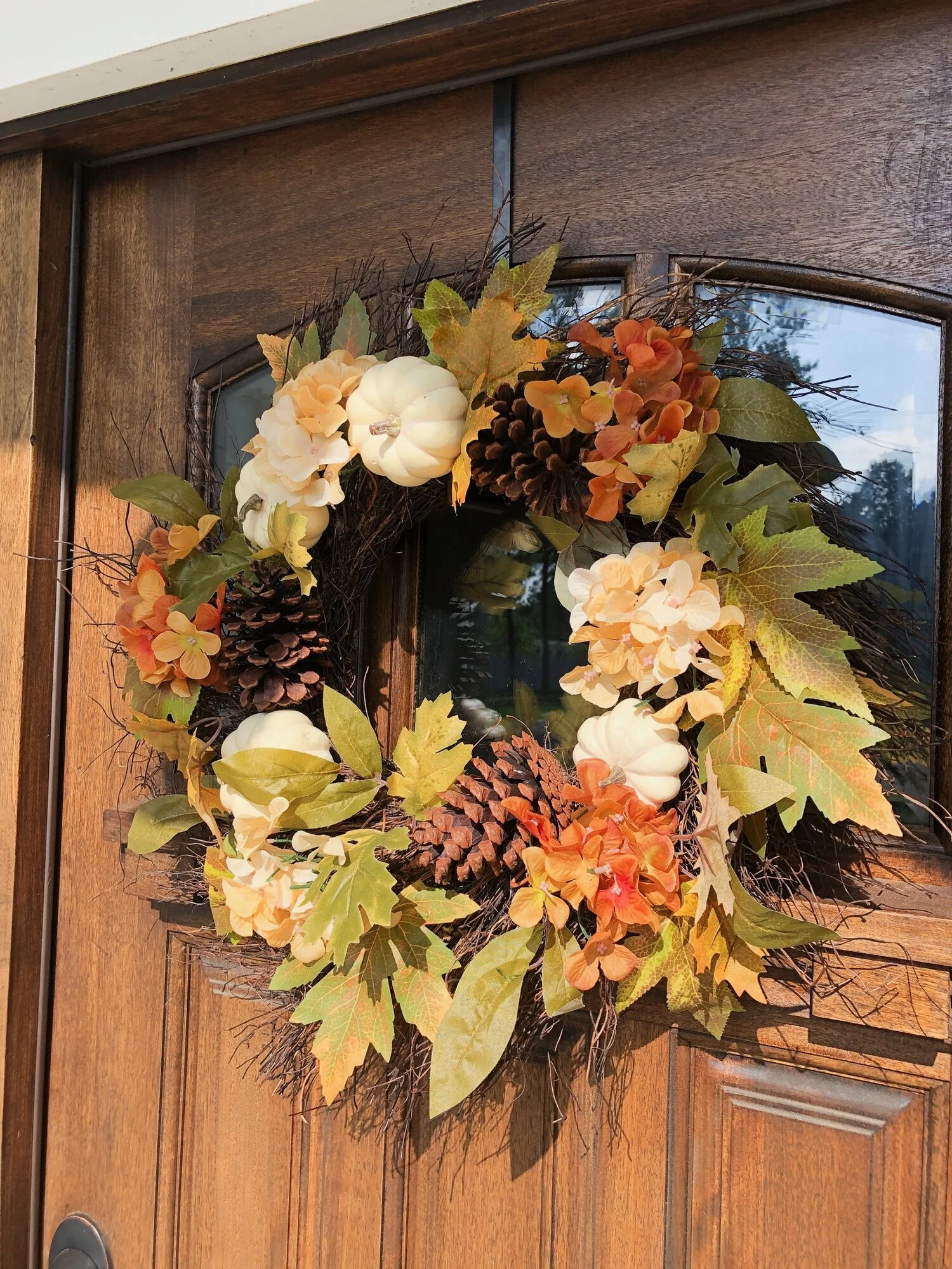 I’ve been looking for the perfect fall wreath since last season and finally found one that’s just “me” from Walmart. It’s full of white pumpkins, hydrangea, pinecones and leaves — all things I love — and even though it’s faux, looks surprisingly realistic! It fits perfectly on our wreath hook and totally makes the front door.