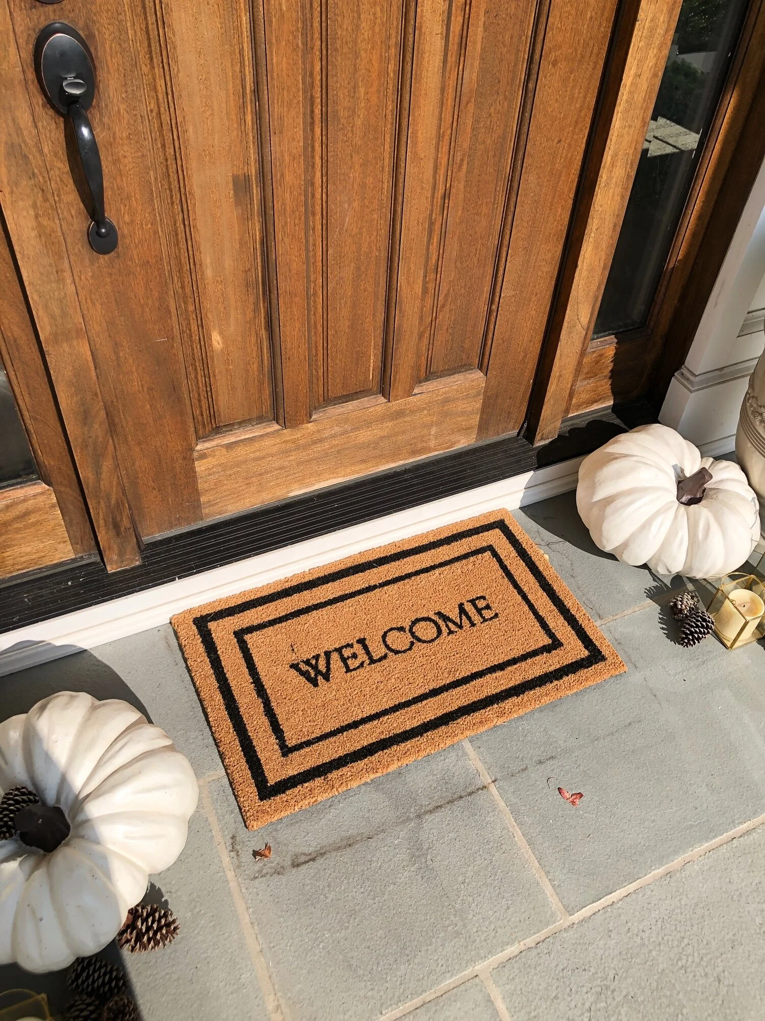 I also added a new “Welcome” doormat to our front door since our old one was looking less than stellar. This one is pretty large, which fits perfectly centered between some large white pumpkins.