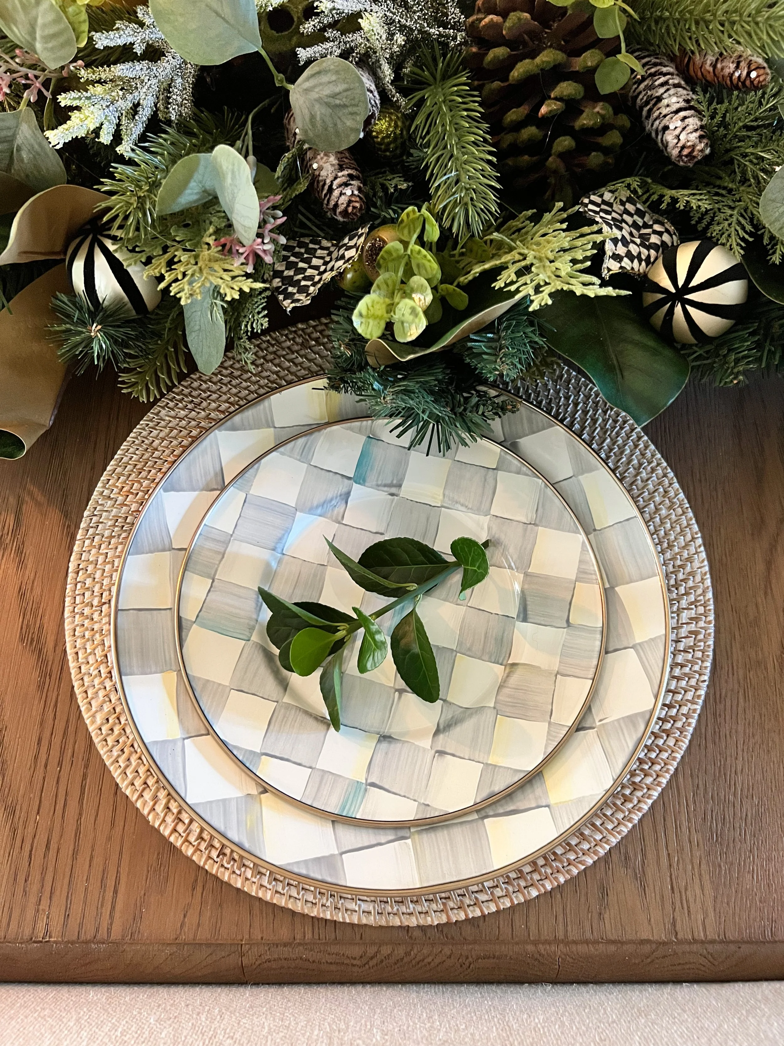 It wouldn’t be a MacKenzie-Childs table without more check, so I layered in the cutest pair of Checkmate Deer and then topped it all off with Sterling Check dinnerware (I love it in the new gray colorway!).