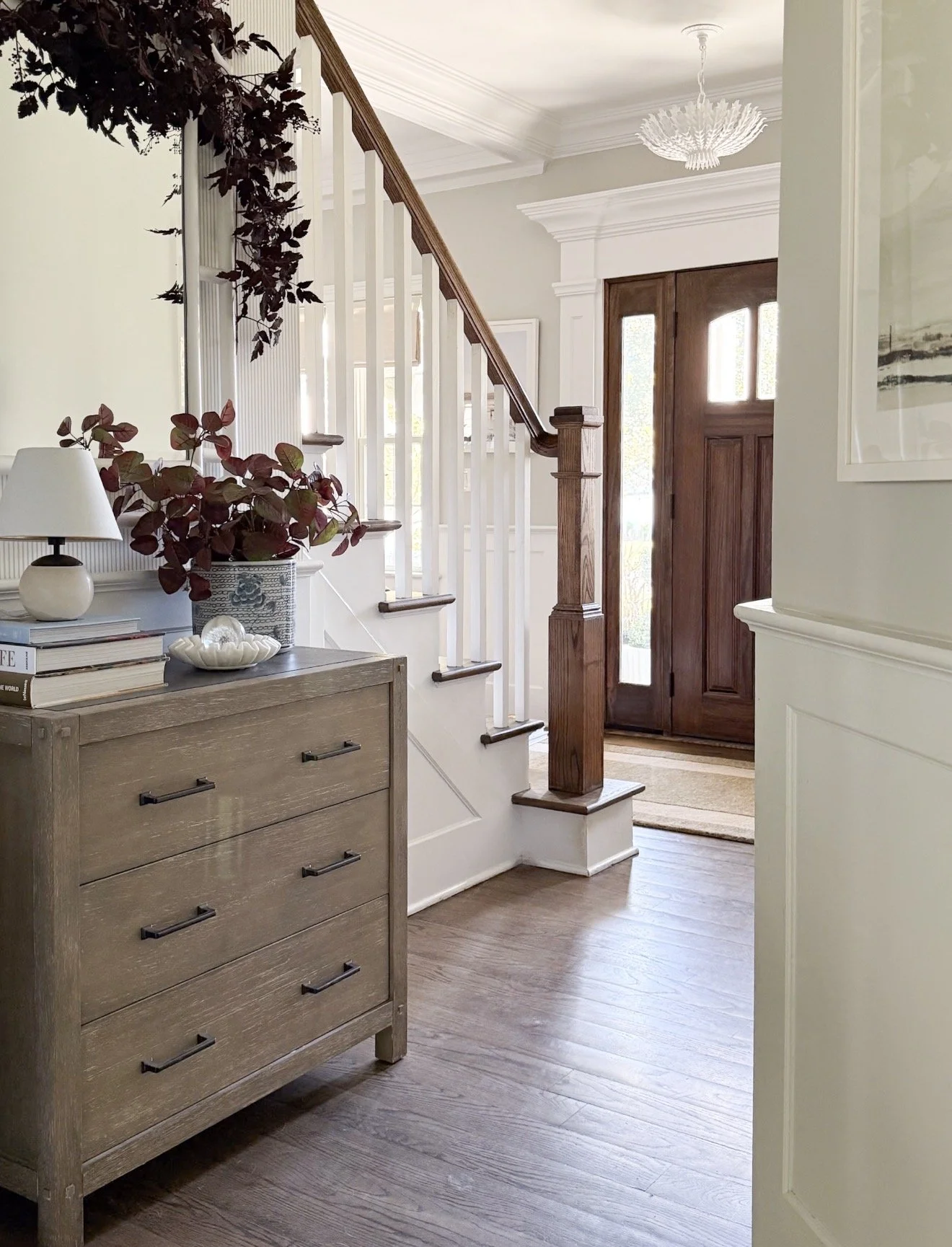 A dresser in the entryway can be the perfect home for cold weather gear (hats, scarves, gloves), pet essentials or anything else you might need as you walk out the door. We have a small dresser by our front doos where I store all of our candles and hats!