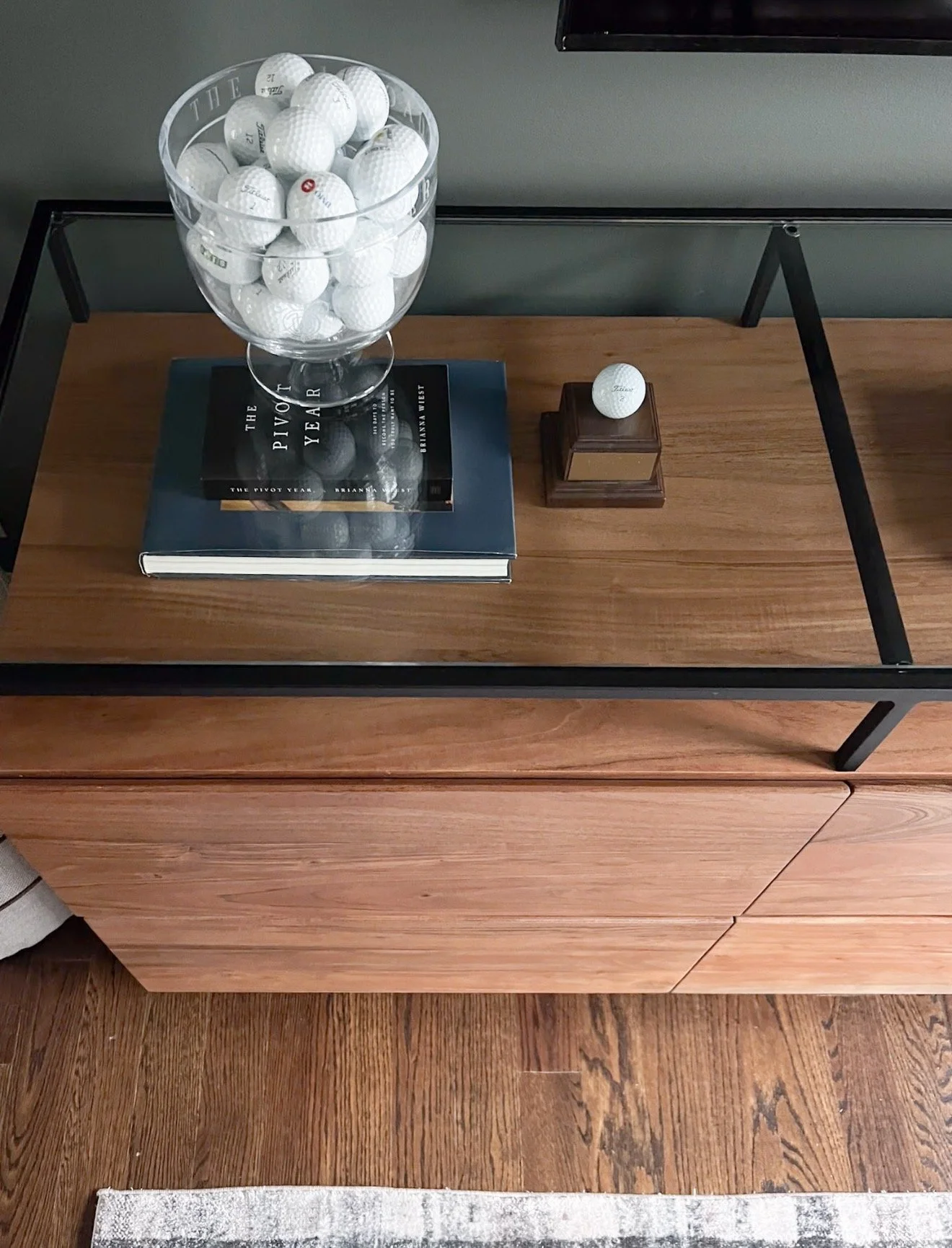 A dresser in the living room can hold everything from toys and games, to spare throw blankets or candles. Invest in something that you absolutely love and can transition over the years based on your everyday routine and how you host.