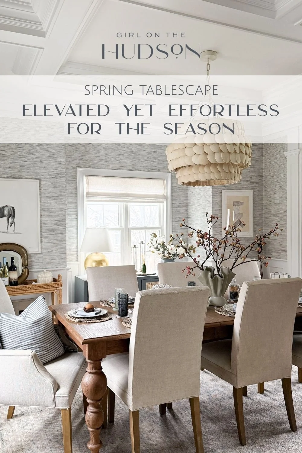 Wallpaper | Dining Table | Similar Dining Chairs | Similar Woven Placemats | Dinner Plates | Linen Napkins | Silverware | Blue Highball Glasses | Coasters | Ceramic Vase | Artificial Fuschia Branches | Dot Detail Ceramic Bowl | Faux Speckled Eggs | Faux Nests & Mini Eggs | Match Cloche | Capiz Scalloped Round Hurricanes | Brass Bunny Decor