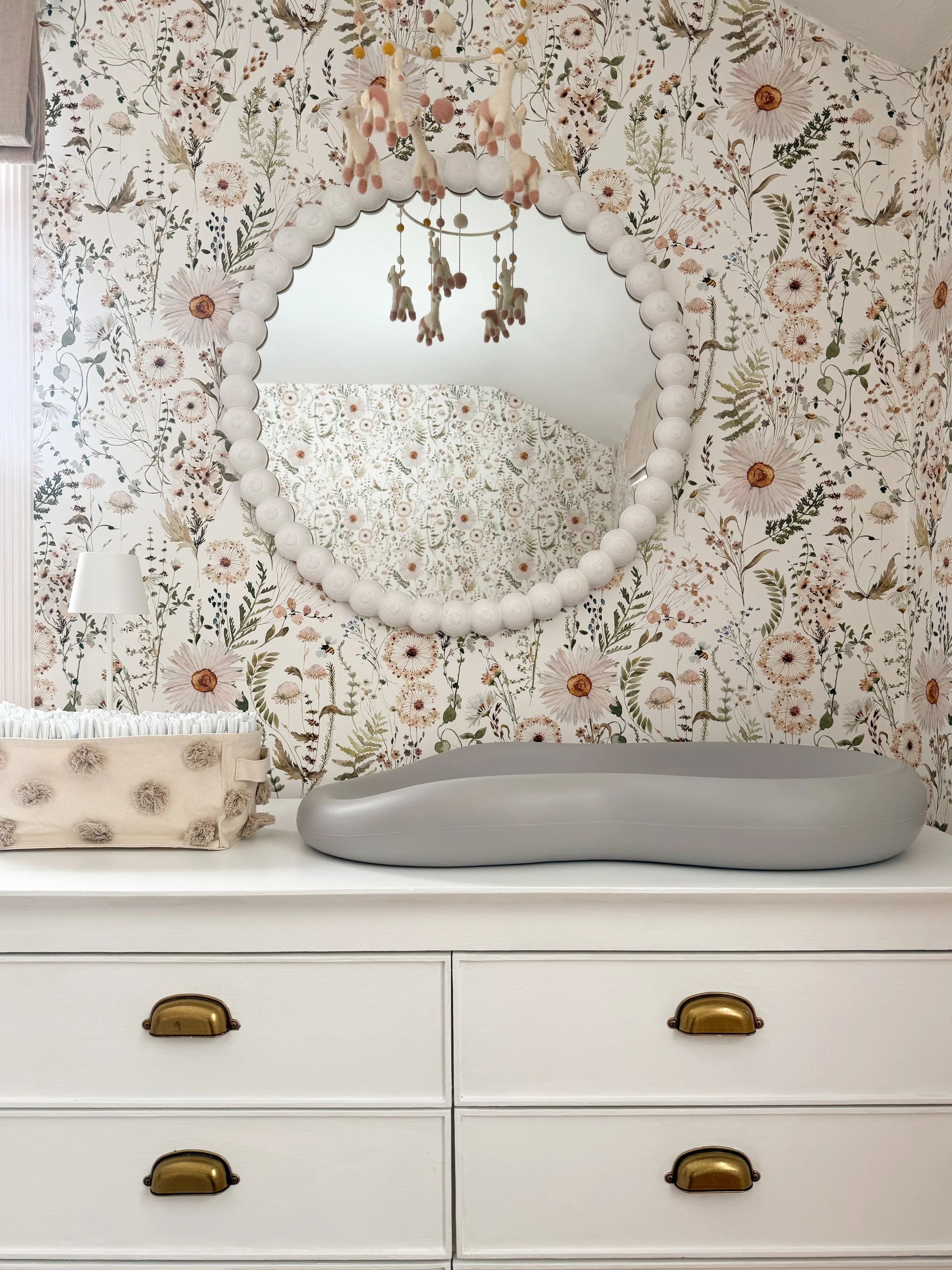 Similar Dresser | Wallpaper | Table Lamp | Pom Pom Bin | Changing Pad | Mirror | Mobile