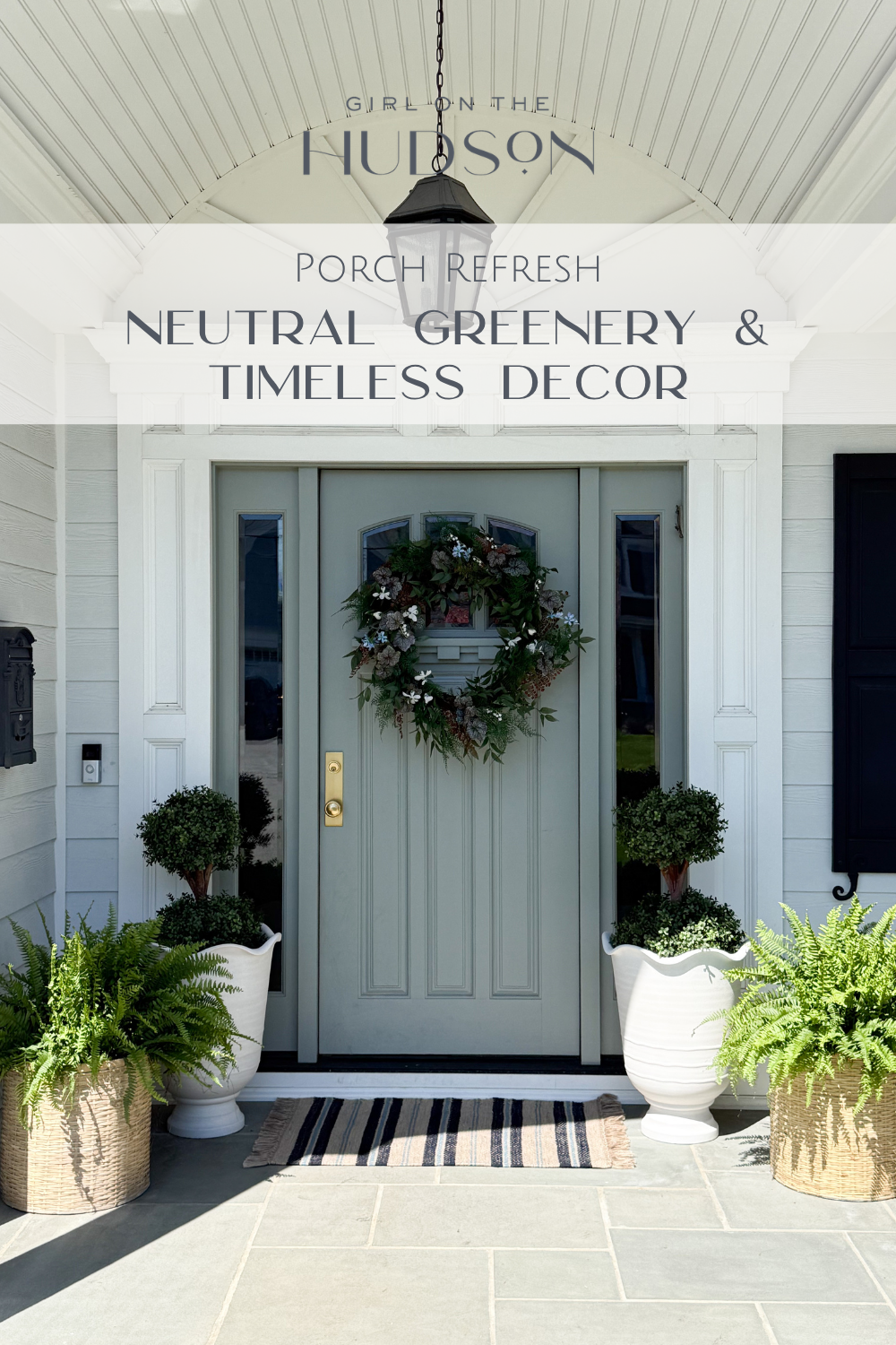 Spring Front Porch Refresh with Neutral Greenery and Timeless Outdoor Decor